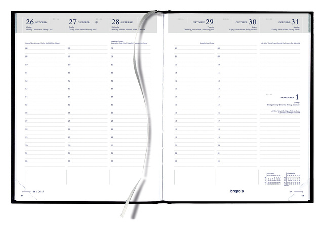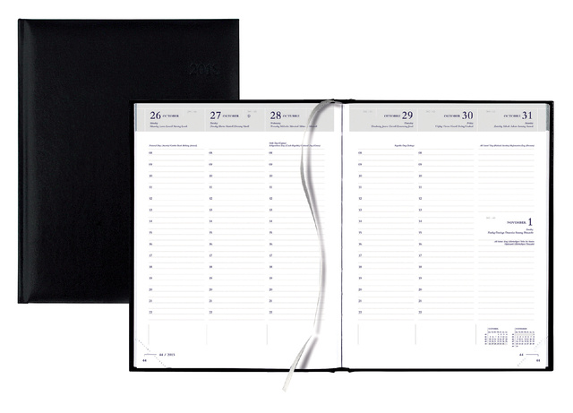 * 17,1x22cm. * Uurindeling. * Hoekperforatie. * Leeslint. * 70gr papier. * Tweekleurendruk. * Maandkalender op elke pagina. * Extra ruimte voor notities en telefoontjes. * Garengebonden. * Kunstlederen omslag. * Viertalig. * FSC-gecertificeerd.