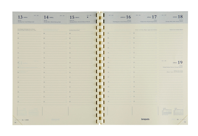 * Agendaformaat 16,8 x 22 cm. * Uurindeling 8.00 - 22.00 uur. * Hoekperforatie. * 70 gr papier. * Tweekleurendruk. * Maandkalender op elke pagina. * Extra ruimte voor notities en telefoontjes. * Gespiraleerd. * FSC-gecertificeerd. * Zestalig. * Crème-kleurig papier.