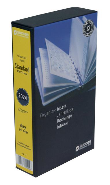* De complete Succes inhoud zit in een stevige archiefbox. * Naast het calendarium bevat deze box: een transparant beschermblad, personaliakaart, tabkaarten, een verjaardagskalender, een overzicht voor regelmatige betalingen, maandblaadjes, things-to-do, kaspapier, een alfabet, notitiepapier en diverse informatiebladen en landkaarten. * Afmetingen: 184 x 37 x 111 mm.