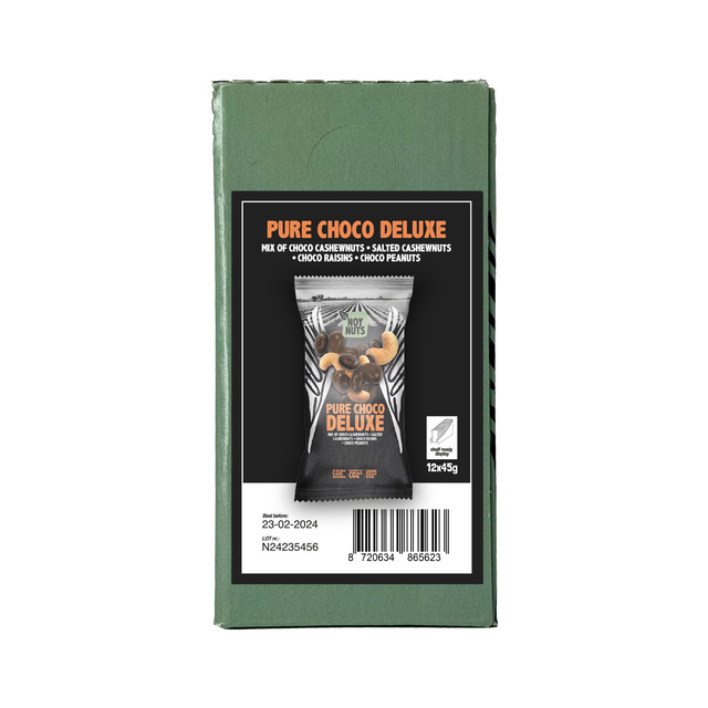 * Pure Choco Deluxe (Gechocolateerde cashews, gechocolateerde rozijnen jumbo, gechocolateerde pinda's jumbo en gezouten cashews).