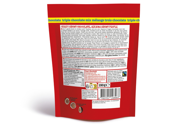 * Al 't goede komt in drieën toch? Dachten wij nou ook. Daarom 3 lagen chocolade voor een 3 dubbel feestje in je mond. Romige melk, donkere pure en witte chocolade in de mix voor chocofans die niet kunnen kiezen.Hoeft dus ook niet. Dat wordt lekker grabbelen geblazen!