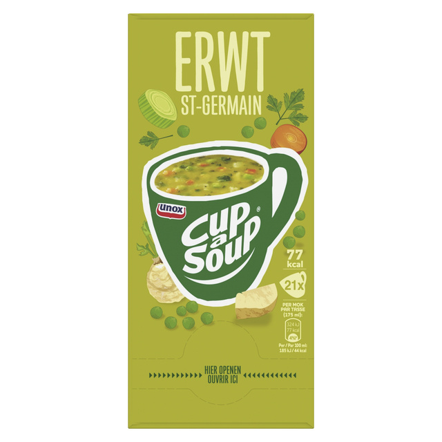 * Unox Cup-a-Soup Erwt . * Bevat 21 zakjes voor 21 heerlijke mokken soep . * 77 calorieën per mok . * Zonder toegevoegde smaakversterkers, kunstmatige kleurstoffen en conserveermiddelen . * Geschikt voor vegetariërs . * Een heerlijk tussendoortje . 1 doos x 21 zak