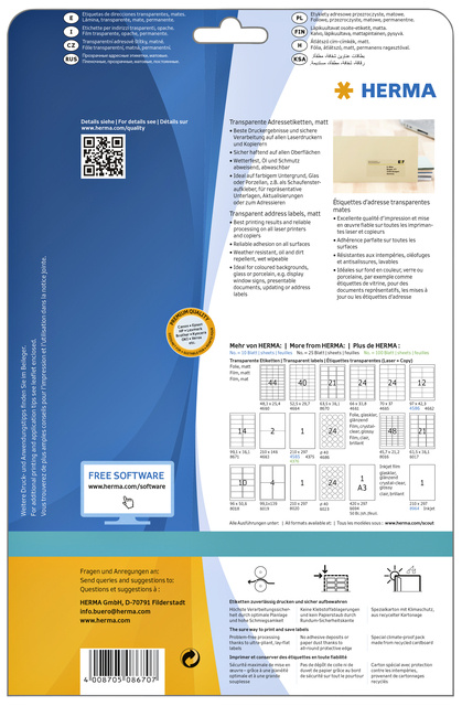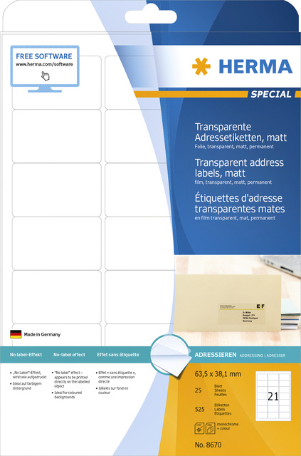 * Transparante matte folie-etiketten, etiketformaat 63.5x38.1mm op A4-vellen. * 25vel per verpakking. * Permanent zelfklevend. * Perfect voor optisch hoogwaardige toepassingen, ideaal op een gekleurde ondergrond, glas, porselein, voor representatieve documenten, updates of om te adresseren. * No-label-effect: opschrift lijkt direct opgedrukt. * Weervast, verouderingsbestendig, olie en vuil afstotend, afwasbaar. * Storingvrije verwerking dankzij veiligheidsrand rondom en optimale vlakligging. * Voor laserprinters en kopieerapparaten, kleurenlaserprinters en kleurenkopieerapparaten. * Niet geschikt voor inkjetprinters. * Gratis softwareoplossingen: www.herma.com/software.