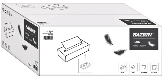 * Katrin 11797 Facial Tissue's Plus. *Hoogwit. *2-laags. *Formaat Tissue 21x20.5cm. *100 Tissues per pak. * Voorzien van EU milieukeur én Nordic Swan.