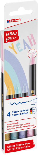 * De edding 1200 glitter viltstiften combineren viltstiften met kleurintensieve glitter voor een heel bijzonder schrijfeffect en laten je creaties afhankelijk van het licht anders glinsteren. * De glitterpennen met fijne ronde punt van 3 mm zijn ideaal voor schrijven, schetsen en lay-outwerk op licht papier. Dankzij de soepel glijdende punt en de sneldrogende. * Reukarme inkt bieden ze een aangenaam schrijfgevoel tijdens het creatieve proces zonder dat de kleur vlekt. * Als cadeau of als creatieve hobby - onze glitter vezelstiften staan garant voor schilderplezier en inspiratie. * De glitterpennen zijn verkrijgbaar in een set van 4 of 5 in 9 verschillende basis- en pastelkleuren en kunnen het hele jaar door worden gebruikt voor verjaardagen, Pasen, Kerstmis, jubilea om op ansichtkaarten en wenskaarten te schrijven en ze te versieren, cadeauzakjes, plaatskaartjes, slingers, enz. * Ontdek de wereld van glitterpennen en geef elk kunstwerk een bijzonder sprankelend effect!.