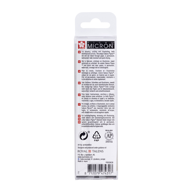 * Met deze selectie van 3 Sakura Pigma Micron fineliners in de kleuren zwart, koelgrijs en lichtkoelgrijs kun je met de opbouwende grijstinten gebruik maken om nog meer schaduwen, diepte, visuele accenten en lagen toevoegen aan oa illustraties, tekeningen, bullet journal spreads. * De Pigma Micron pennen zijn watervaste en permanente fineliners die favoriet zijn bij de diverse doelgroepen. * De fijne punt maakt deze pen ideaal voor zowel technische als artistieke tekeningen. * Deze Pigma Micron is de allereerste wegwerpbare technische pen die gebruik maakt van pigmentinkt van archiefkwaliteit. De inkt loopt niet uit, vloeit niet uit en drukt niet door op de meeste soorten papier.