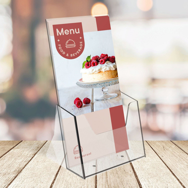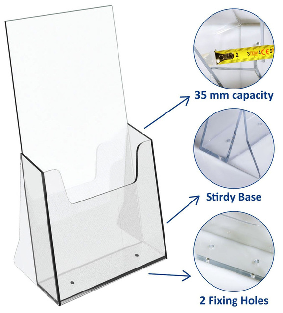* Folderbakje voor een glasheldere presentatie van folders, catalogi en prijskaarten. * Stevig en glashelder hoogwaardig kunststof. * Capaciteit 35mm. * In verschillende formaten verkrijgbaar.
