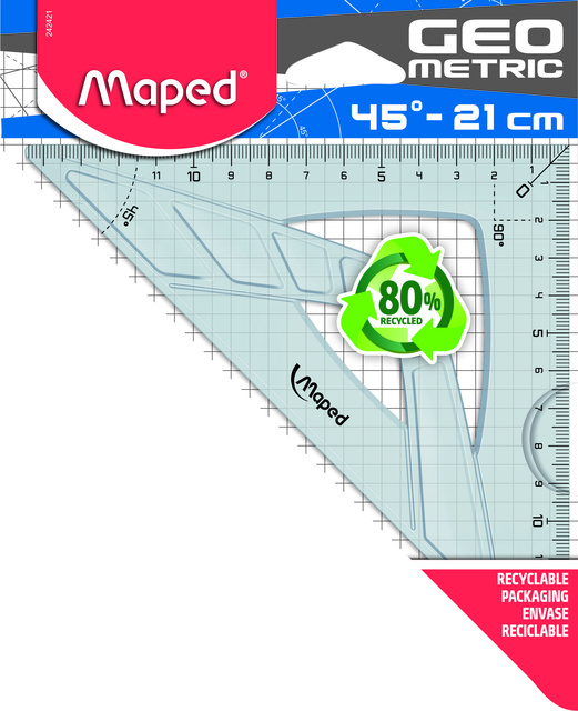 * Transparante driehoek van 21cm met 2 hoeken van 45° en hoek van 90°. * Bestaat uit 80% recycled plastic en is verpakt in een 100% recycleerbare kartonnen verpakking.