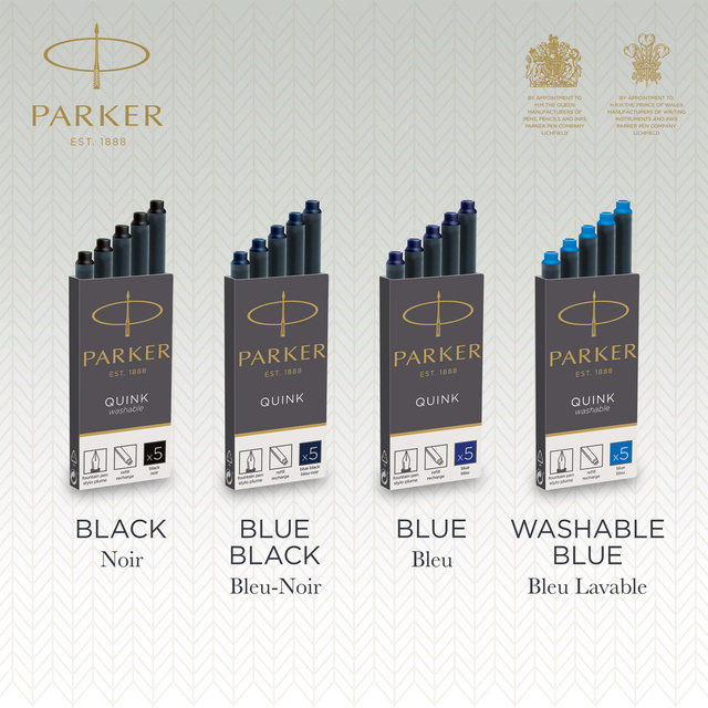 * Geniet van een traditionele schrijfervaring met een vulpen en het gemak van inktvullingen. * De PARKER QUINK patronen zijn gevuld met zachte, rijke en levendige blauwzwarte vulpeninkt en zijn ontworpen voor gebruik met PARKER vulpennen. * Geniet van het gevoel van een pen die soepel over het papier glijdt met de hoogwaardige QUINK inktpen-vulling.