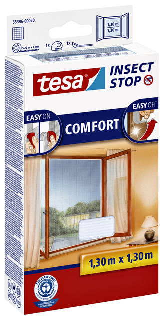 * tesa® Insect Stop COMFORT Klittenband voor ramen is een bescherming tegen muggen en insecten dat met een speciaal systeem zo kan worden geplaatst en verwijderd. * tesa® Insect Stop COMFORT Klittenband voor ramen biedt effectieve bescherming tegen insecten met klittenband waarmee je je ramen open kunt houden zonder dat insecten binnen kunnen komen. * Het is verkrijgbaar in twee kleuren en twee maten, geschikt voor de meeste kozijnen. * Dankzij het easy-on- en easy-off-systeem is het snel en eenvoudig te plaatsen en verwijderen. * Gebruik de meegeleverde klittenbandtape om het op het raamkozijn te plakken en de druktool om het gaas er stevig tegenaan te drukken. * Om het gaas weer te verwijderen, trek je het er gewoon vanaf. * Afmeting 1.30x1.30m. * Wit . * UV-bestendig. * Wasbaar op max 30°C. * Herbruikbaar.