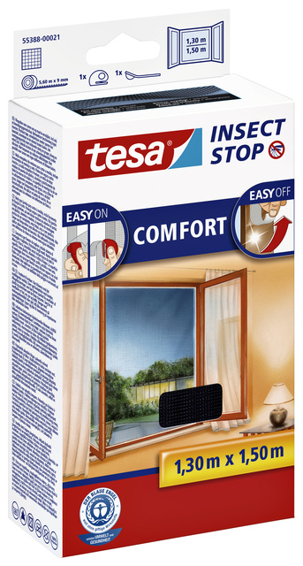 * tesa® Insect Stop COMFORT Klittenband voor ramen is een bescherming tegen muggen en insecten dat met een speciaal systeem zo kan worden geplaatst en verwijderd. * Het bevat een easy-on- en easy-off-oplossing waarmee je het raam open kunt laten staan en de muggen en andere insecten buiten kunt houden. * Deze zeer effectieve hor is verkrijgbaar in twee kleuren en verschillende maten, geschikt voor de meeste kozijnen. * De Insect Stop is snel en eenvoudig te plaatsen: plak de meegeleverde klittenbandtape gewoon op het raamkozijn, druk het gaas ertegen en je bent klaar. * Verwijderen van het gaas is al net zo eenvoudig en laat geen zichtbare sporen achter. * Afmeting 1.30x1.50m. * Zwart. * UV-bestendig. * Wasbaar op max 30°C. * Herbruikbaar.