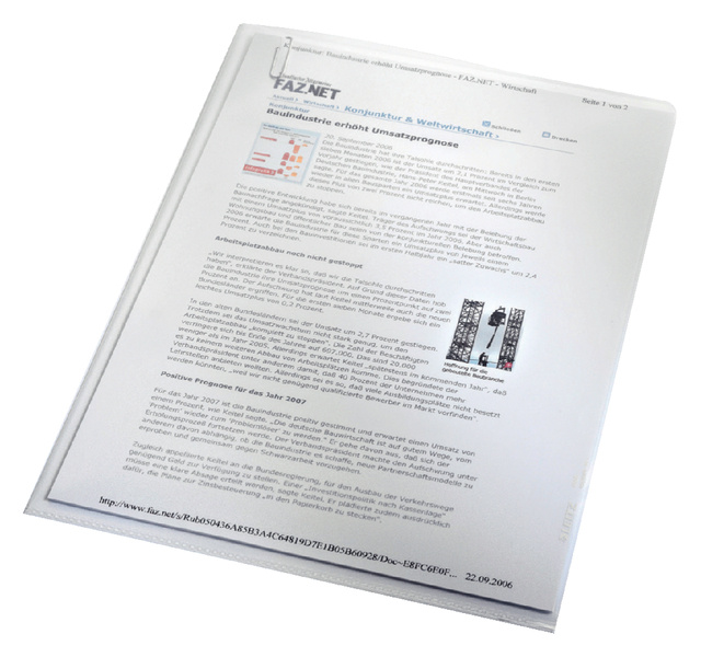 * Premium kwaliteit zichtmap voor dagelijks gebruik en handige opberging van documenten. *Gestructureerde 0,13 mm recyclebare PP folie, copysafe. * Extra grote uitsnede voor gemakkelijk openen. * Opening aan boven- en rechterzijde. * Voor A4 formaat.