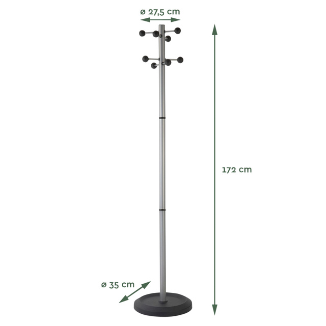 * De Kapstok Monaco van BRASQ is een staande kapstok die beschikt over 8 stevige haken en ruimte biedt aan 8 jassen. * Deze kapstok past met zijn uitstraling in alle werkruimten. * De Monaco kapstok is gemaakt van hoogwaardig staal en is afwerkt met een zilveren poedercoating. * Deze beschermlaag zorgt ervoor dat het product extra lang meegaat, niet verkleurd en kraswerend is. * Daarnaast levert het ook een chique uitstraling op. * Alle BRASQ kapstokken beschikken over een verzwaarde voet met een kunststof behuizing wat zorgt voor een solide staande kapstok. * De BRASQ kapstok Monaco wordt als een bouwpakket geleverd. In slechts een paar eenvoudige stappen staat deze kapstok in elkaar. * De handleiding wordt uiteraard meegeleverd. * Diameter voet: 35cm. * Diameter stalen buis: 35mm.