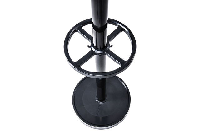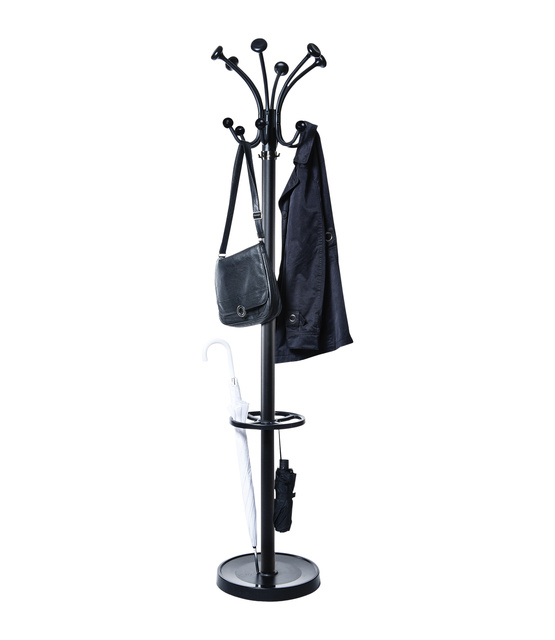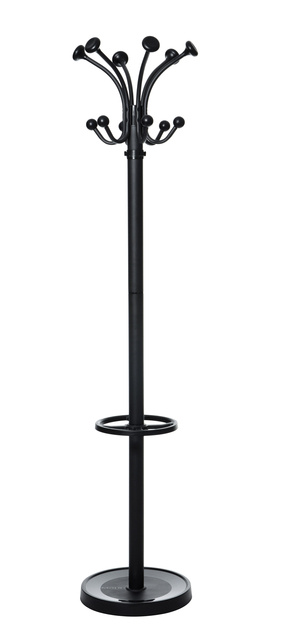 * Stevige, staande kapstok van staal voor sterke belasting. * Extreem stabiel: zware betonvoet met kunststof afdekking en vilten vloerbescherming. * Maul-design: glanzende voet met mat geërodeerde plekken, krasbestendig tegen paraplupunten. * Veilig: afgeronde kunststof knoppen sparen de kleding. * Past discreet in elke omgeving. * Zuil Ø 5 cm, matzwart gepoedercoat. * 6 mutshaken en 6 jashaken van metaal, 4 extra haken van kunststof aan de zuil en aan de paraplubak. * Kunststof knoppen: mutshaken Ø 5,5 cm, jashaken Ø 3,8 cm, van onbreekbaar ABS. * Draaibare kroon, Ø 41 cm, voor gemakkelijke toegang aan alle kanten. * Inclusief parapluhouder, Ø 27 cm, voor maximaal 8 paraplu's en 4 zakparaplu's. * Voet Ø 36,5 cm, gewicht 6 kg. * Eenvoudige montage. * Totale hoogte: 176 cm.