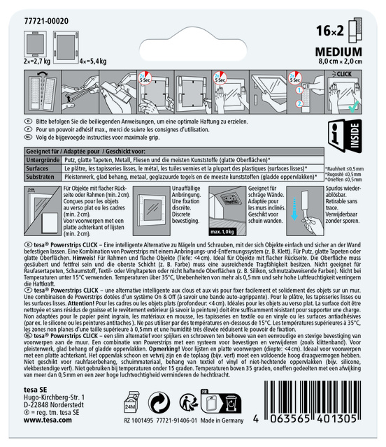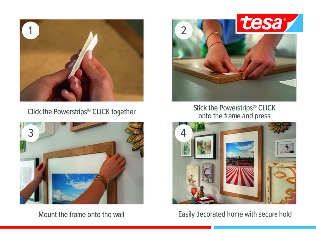 * Decoraties zorgen voor de finishing touch in een stijlvol huis of werkomgeving. De tesa® Powerstrips CLICK bieden het ideale alternatief voor spijkers en maken het makkelijk om fotolijsten en andere vlakke wanddecoraties te bevestigen. Het unieke klikgeluid laat u weten dat het voorwerp goed op zijn plaats zit. * Eenvoudige decoratie: Foto's en vlakke wanddecoraties kunnen eenvoudig worden bevestigd met Powerstrips® CLICK * Discrete montage: De Powerstrips® CLICK worden volledig bedekt door het decorstuk of de fotolijst. * Auditieve veiligheid: Een klikgeluid geeft aan dat de klittenbandelementen correct zijn ingehaakt * Kan opnieuw worden gebruikt: Geef foto's en decoraties een nieuwe look zonder de zelfklevende strips los te maken * Verwijderbaar: De zelfklevende bevestiging kan in een handomdraai van de muur worden gehaald zonder resten achter te laten