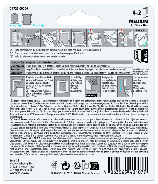 * Decoraties zorgen voor de finishing touch in een stijlvol huis of werkomgeving. De tesa® Powerstrips CLICK bieden het ideale alternatief voor spijkers en maken het makkelijk om fotolijsten en andere vlakke wanddecoraties te bevestigen. Het unieke klikgeluid laat u weten dat het voorwerp goed op zijn plaats zit. * Eenvoudige decoratie: Foto's en vlakke wanddecoraties kunnen eenvoudig worden bevestigd met Powerstrips® CLICK * Discrete montage: De Powerstrips® CLICK worden volledig bedekt door het decorstuk of de fotolijst. * Auditieve veiligheid: Een klikgeluid geeft aan dat de klittenbandelementen correct zijn ingehaakt * Kan opnieuw worden gebruikt: Geef foto's en decoraties een nieuwe look zonder de zelfklevende strips los te maken * Verwijderbaar: De zelfklevende bevestiging kan in een handomdraai van de muur worden gehaald zonder resten achter te laten