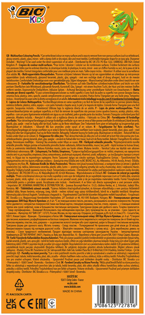 * Laat je creativiteit de vrije loop met de BIC Kids Multisurface driehoekige kleurpotloden! * Dit ultieme brede driekantig potlood voor kunstenaars van alle leeftijden biedt een opmerkelijke veelzijdigheid zodat je moeiteloos kunt schrijven, tekenen en kleuren op heel veel verschillende oppervlakken zoals: papier, whiteboards, keramiek, glas, plastic en karton. * Als het tijd is om schoon te maken, veeg of verwijder je de markeringen of tekeningen op niet-poreuze oppervlakken eenvoudig af met een vochtige doek. * Het brede driekantig potlood zorgt voor meer controle, een comfortabele ergonomische grip en minder vermoeide handen. * Met een breed scala aan levendige en heldere kleuren bieden deze potloden eindeloze mogelijkheden voor het verkennen van nieuwe technieken en het ontdekken en ontwikkelen van je creativiteit. * Til je kunstwerk naar nieuwe hoogten met de BIC Kids Multisurface kleurpotloden. * De Multi-surface kleurpotloden staan garant voor urenlang kleurplezier.