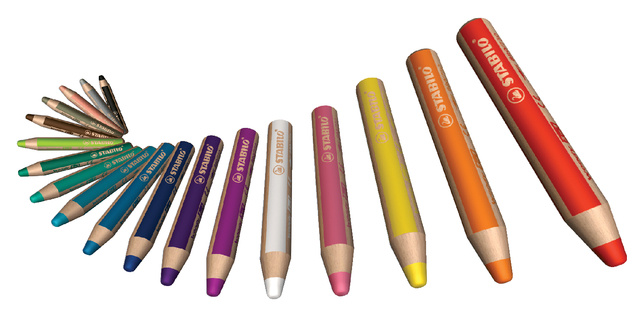 * STABILO Woody. * Het 3-in-1-potlood; kleurpotlood, waskrijt en aquarel potlood ineen. * Hecht op bijna alle ondergronden zoals glas, leer, metaal en natuurlijk papier. * Door zijn veelzijdige gebruiksdoeleinden is vrijwel ieder idee met de woody vorm te geven. * Extra-dikke stift Ø10mm. * Volledig te mengen met water. * Bijzonder goede dekkingsgraad, zelfs op donkere kleuren en ondergrond.