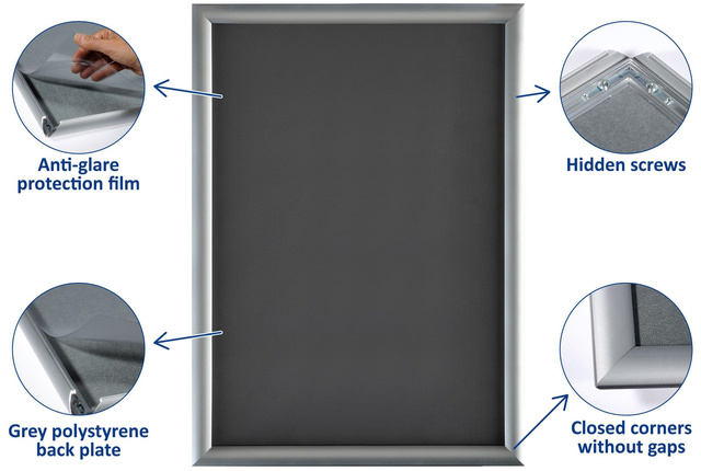* Kliklijst van geanodiseerd aluminium. * Kunststof achterzijde en helder transparant ontspiegeld voorzetfolie. * Met Easy-Click-systeem voor een snelle, eenvoudige en representatieve montage. * Profiel 25mm.