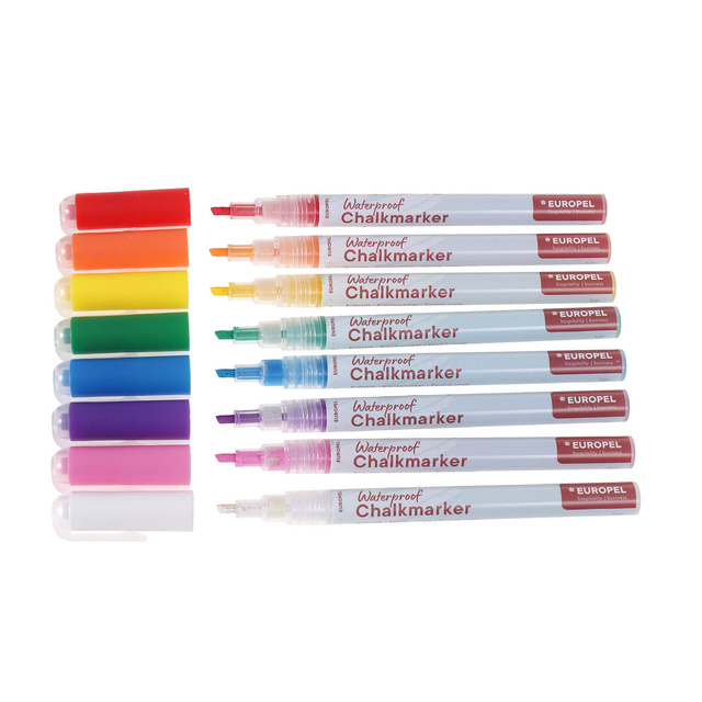 * Ontdek de watervaste krijtstiften 1-3mm in een 8 kleuren assortiment etui, perfect voor al je creatieve projecten. * Deze set bevat 8 levendige kleuren: rood, paars, blauw, oranje, roze, geel, groen en wit. * Ideaal voor het maken van opvallende borden, raamdecoraties en kunstwerken. * De 1-3mm punt maakt perfecte smalle en strakke lijnen mogelijk, afhankelijk van de hoek waarin je de stift houdt. * De watervaste inkt zorgt ervoor dat je ontwerpen helder blijven, zelfs bij blootstelling aan water. * Dit maakt ze ideaal voor gebruik op buitenborden, ramen en andere oppervlakken die kunnen worden blootgesteld aan weersomstandigheden. * Je ontwerpen en boodschappen blijven helder en duidelijk, ongeacht de omstandigheden. * Deze stiften zijn gemaakt van niet-giftige materialen, snel drogend en geurloos, wat ze veilig en gebruiksvriendelijk maakt. * Of je nu een kleurrijk menu voor een café wilt maken, een opvallend raamdisplay wilt ontwerpen, of gewoon wil experimenteren met verschillende kleuren in je kunstwerken, deze set heeft alles wat je nodig hebt. * De intense, dekkende kleuren zorgen ervoor dat je ontwerpen echt tot leven komen.