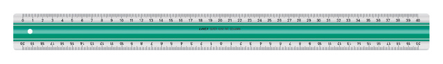* Beide zijden afgeschuind, speciaal voor inkttekeningen. * Precisieverdeling in mm. * Nulpunt in het midden van een zijde. * Kristalhelder acryl met groene middenbaan. * 20 en 30cm versie met rubberen strip en acrylstrip waardoor de liniaal niet gekanteld en geschoven kan worden. * 40 en 50cm versie met twee rubberen strips. 1 stuk