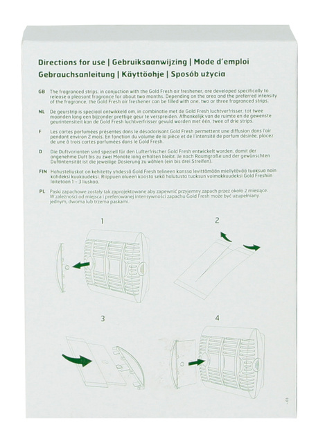 * Geurstrip met de karakteristieken van een kruidige bloemengeur. * Deze luchtverfrisser is speciaal ontwikkeld om, in combinatie met de geurstrips, tot twee maanden lang een bijzonder prettige geur te verspreiden. Afhankelijk van de ruimte en de gewenste geurintensiteit kan de Gold Fresh luchtverfrisser gevuld worden met één, twee of drie strips. * Verwisselen van de geurstrips is eenvoudig, snel en probleemloos *