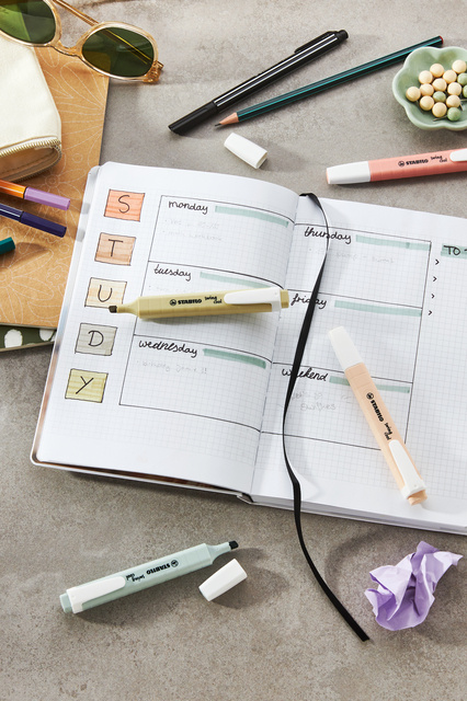 Trendy zachte tinten geinspireerd op de natuur|Gebruik de clip om de markeerstift aan je notitieboek of agenda vast te maken|Tot 4 uur geconcentreerd werken dankzij de anti-uitdroogbescherming|2 lijndiktes: 1 mm + 4 mm|Inkt op waterbasis