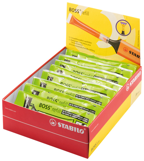 * De STABILO BOSS ORIGINAL navulling is en navulsysteem voor STABILO BOSS ORIGINAL, STABILO BOSS SPLASH en de STABILO GREEN BOSS markeerstiften. * De handige navullingen zet je makkelijk op de punt en zo vul je de markeerstift na. * Iedere navulling is los verpakt.