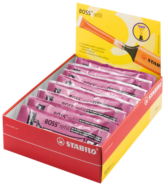 * De STABILO BOSS ORIGINAL navulling is en navulsysteem voor STABILO BOSS ORIGINAL, STABILO BOSS SPLASH en de STABILO GREEN BOSS markeerstiften. * De handige navullingen zet je makkelijk op de punt en zo vul je de markeerstift na. * Iedere navulling is los verpakt.