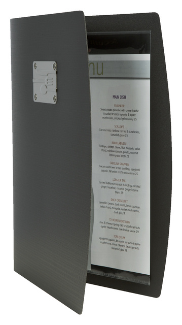 * Kunststof menu- of wijnkaarten van hoogwaardige kwaliteit. * Voorzijde voorzien van een zilverkleurige metalen plaat met een ingestantste tekst. * Kaart voorzien van 1 transparant inlegvel voor presentatie van 4 A4 vellen.