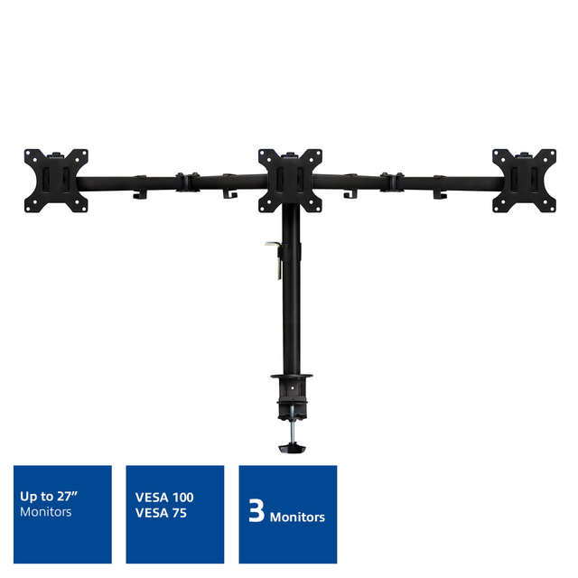* Universele bureausteun geschikt voor drie monitoren tot 27" en 7kg. * Eenvoudig in hoogte verstelbaar zonder gereedschap door het handige schroefsysteem. * Geïntegreerd kabelmanagementsysteem en opbergsysteem voor de inbussleutel. * Handige schermaanpassingen: kantelen, roteren, zwenken. * Met 3 draaipunten voor het instellen van de ideale kijkafstand. * Bureauklem en bureaudoorvoersysteem voor het bevestigen op en door een tafel. * Creëer een ergonomische en ruimtebesparende werkplek door gebruik te maken van de volledig metalen AC8303 Monitorsteun voor 3 monitoren. * Plaats drie beeldschermen op de ideale hoogte en kijkhoek voor een betere zithouding en voorkom daarmee rug-, nek- en schouderklachten. * De AC8303 Drievoudige Monitorsteun is geschikt voor maximaal 3 schermen tot en met 27 inch en 7kg en is gemakkelijk te monteren aan een bureau met het klem- of bureaudoorvoersysteem. * Verklein de kans op rug-, nek- en schouderklachten, de AC8303 is eenvoudig zonder gereedschap in hoogte en diepte te verstellen door het handige schroefsysteem. * Kantel, zwenk en roteer de schermen voor het creëren van een ideale ergonomische werkhouding waardoor je de kans op rug-, nek- en schouderklachten verkleint. Kabels zijn netjes weg te werken dankzij het handige kabelmanagementsysteem. * Met handig beeldschermmontagesysteem, pas de 3 monitoren aan naar je eigen voorkeur door het instellen van de ideale kijkafstand. * De bureausteun is geschikt voor drie schermen tot en met 27 inch met elk een maximum gewicht tot en met 7kg. De AC8303 is uitgerust met VESA 75x75 en 100x100. * Dankzij het handige beeldschermmontagesysteem kun je alle drie de monitoren zelf op de steun bevestigen. De bureausteun wordt compleet geleverd met alle montagemiddelen voor zowel klem- als doorvoermontage.