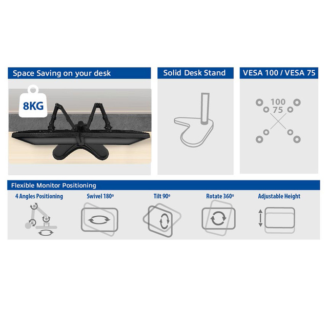 * Universele dubbele monitorsteun op voet met easy mounting systeem voor het gemakkelijk monteren van twee monitoren tot 32 inch en 8kg elk met VESA 75x75 en 100x100. * Verstel de hoogte, kantel, roteer of zwenk de schermen om nek- en rugklachten te voorkomen. * Geïntegreerd kabelmanagementsysteem en inbussleutelopbergsysteem. * 3 Draaipunten voor het instellen van de ideale kijkafstand. * De AC8320 Bureausteun voor 2 monitoren is uitgevoerd in metaal en zorgt voor een ergonomische en ruimtebesparende werkplek. * De steun heeft een voet waardoor je hem eenvoudig op je bureau neer zet. * Plaats gemakkelijk twee beeldschermen (tot 32 inch en 8 kg elk) aan de bureausteun met het speciale easy mounting systeem. Vervolgens stel je de ideale hoogte en kijkhoek in. * Elk scherm is individueel uit te lijnen. Kantel, zwenk of roteer de schermen zodat deze de optimale positie hebben en rug-, nek-, en schouderklachten worden voorkomen. * De standaard heeft een geïntegreerd opbergsysteem voor kabels en inbussleutels. * Voorkom rug-, nek-, en schouderklachten door de in hoogte verstelbare monitorsteun. * Plaats twee monitoren (tot en met 32 inch en 8kg elk) op de ergonomische AC8320 Dubbele Monitor Bureaustandaard. * De steun heeft drie draaipunten voor het instellen van de ideale kijkafstand en zorgen van ruimtebesparing op je werkplek. * De hoogte en de kijkhoek van de schermen stel je eenvoudig naar je eigen wensen af. Lijn de schermen individueel uit of kantel, zwenk of roteer ze. Je voorkomt rug-, nek-, en schouderklachten. * Handig beeldschermmontagesysteem, de AC8320 is uitgerust met VESA 75x75 en 100x100. * Het handige montagesysteem zorgt ervoor dat je eenvoudig zelf de beeldschermen zonder hulp van anderen op de steun kunt plaatsen. Al het montagemateriaal wordt meegeleverd. * De kabels blijven netjes op de plaats met het kabelmanagementsysteem. Daarnaast heeft de AC8320 opbergruimte voor de inbussleutels.