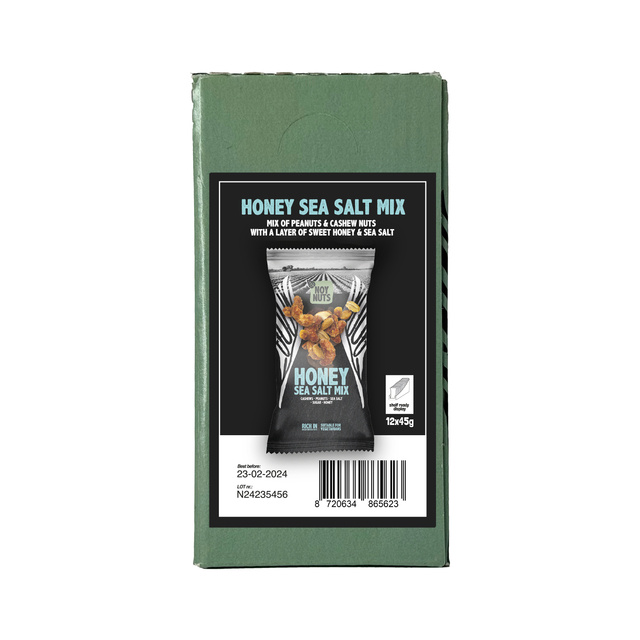 * Honey Sea Salt notenmix, verrijkt met honing en een vleugje zeezout. Een heerlijk tussendoortje waar je echt energie van krijgt en een lekker alternatief voor gangbare chips of snoepgoed.