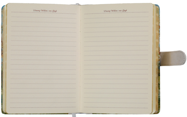 * Notitieboek met een schitterende tekening van Vincent van Gogh op de voor- en achterzijde met de bloesem van een fruitboom tegen een blauwe achtergrond. * Het boek heeft 80 grams gelinieerd zuurvrij papier en een harde kaft met afgeronde hoeken. * Het papier is beschrijfbaar met gewone pen of met vulpen. * Een magneetsluiting en een leeslint ontbreken ook niet aan dit bijzondere notitieboek waar je prima mee voor de dag kunt komen. * Afmeting: 190 x 130 x 25 mm. * Aantal pagina's: 256 stuks. * Gewicht 374 gram.