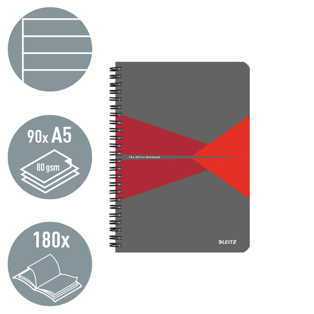 Notitieboek Leitz Office A5 lijn 180 pagina's 80gr grijs rood