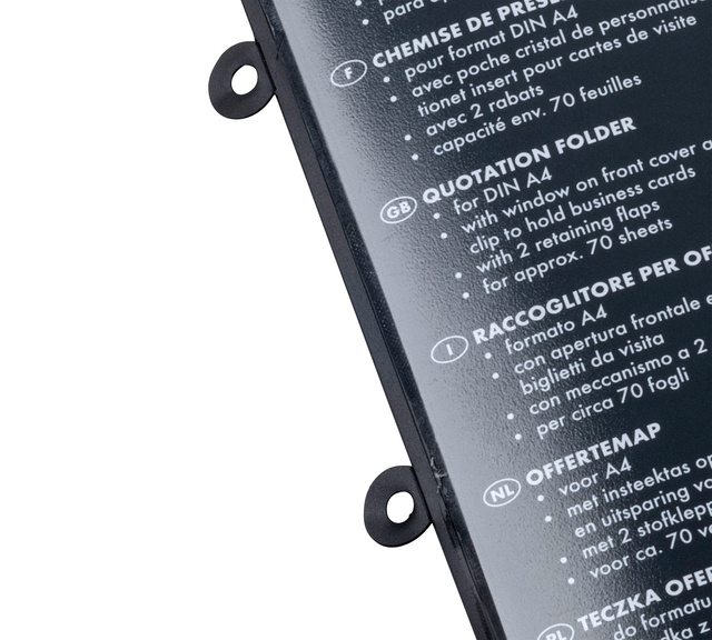 * Kunststof offertemap op A4-formaat. * Met insteektas op de voorzijde voor individuele opmaak. * Insteek voor visitekaartje. * Uitsparingen voor het opbergen in ordners. * Voor het professioneel opbergen van offertes en andere documenten. * Capaciteit 50vel papier. * Met 2 stofkleppen. * Afmetingen 222x315mm.