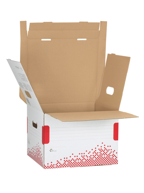 Speedbox bespaart je tijd en moeite. In slechts één snelle handeling klaar voor het archiveren van documenten. Eenvoudig en intuïtief te monteren. Geen handleidingen nodig. *Producteigenschappen; * Super snelle montage, tijdbesparend. *Versterkte zijwanden en bodem voor maximale sterkte en om makkelijk te stapelen. * Met geïntegreerde klep. * Capaciteit: 3 archiefdozen 100. Ook perfect als universele opbergdoos voor opladers, kabels, briefpapier en documenten. *Ideaal voor het vervoeren van grotere stapels documenten of andere benodigde zaken voor vergaderingen en presentaties. * Gemaakt van 100% gerecycled golfkarton, 100% recyclebaar. * FSC® gecertificeerd.