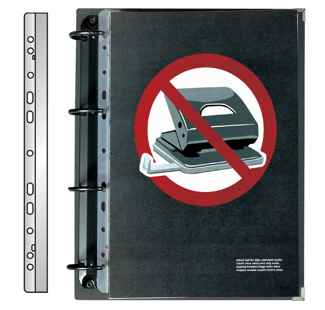 * Zelfklevende dossierstrips. * Voor het opbergen van folders, brieven, catalogi, contracten etc. die niet geperforeerd mogen of kunnen worden, in ordners, ringbanden en hechtmappen. * Soepele transparante polyester stroken met 7 en 8cm perforatie die niet kan uitscheuren. * Aan een zijde een sterk hechtende lijmlaag met gemakkelijk te verwijderen beschermstrook.