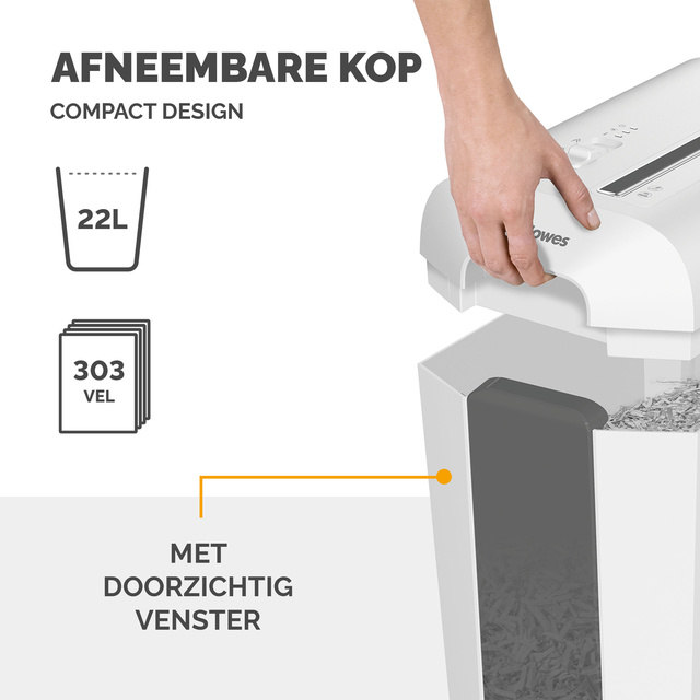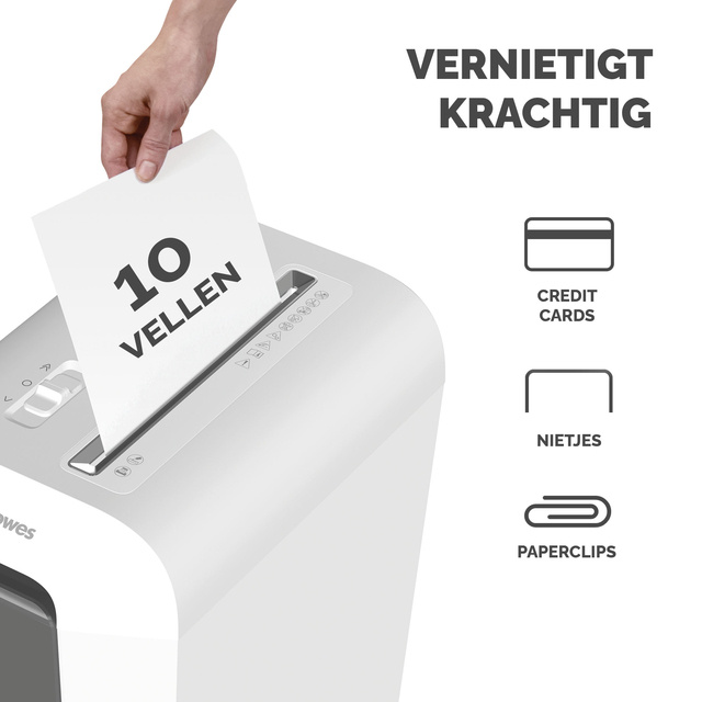 * Papiervernietiger geschikt voor regelmatig gebruik in een thuis- en kantooromgeving. * Vernietigt 10 vellen per keer in 4x40mm cross-cut snippers (DIN-niveau P-4). * Gepatenteerde SafeSense®-technologie stopt met versnipperen wanneer de handen de invoeropening aanraken. * Versnippert continu tot 6 minuten, gevolgd door een 20 minuten durende afkoelperiode. * 22L opvangbak met afneembare kop. * Vernietigt ook nietjes, paperclips en creditcards. * Garantie: 3 jaar machine (2 +1 na productregistratie) / 5 jaar snijmessen.