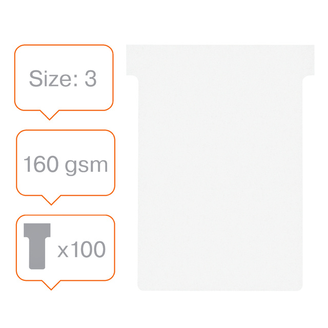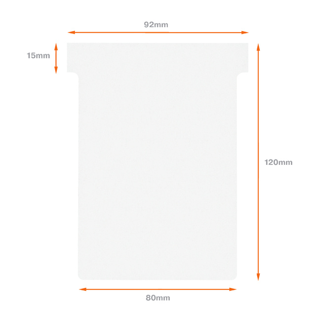 * T-planbordkaarten. * Zichtbaar gedeelte van 15mm voor trefwoord of naam. * Op het onderste deel van de kaart is ruimte voor meer informatie. * Kleur wit * Deze Nobo kaarten passen ook in de planborden van Jalema. * Pak à 100 stuks.