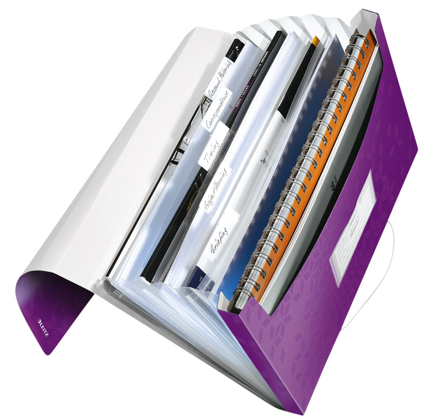 * 6 harmonica vakken met indexlabels voor eenvoudig herkennen van de inhoud. * Vakje aan de voorkant voor het bewaren van losse voorwerpen of een notitieblok. * Aantrekkelijke elastische bandsluiting voor veilig transport van documenten. * Kan worden gecombineerd met standaardmappen, WOW notitieboeken en Leitz CombiFiles. *Capaciteit 200vel A4-formaat (80 gram).