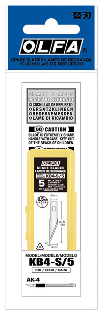 * Vervangmessen voor cutter AK-4. * Mes: 8mm. Dikte: 0,50mm. * Blister à 5 stuks.