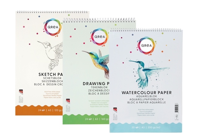 * Of je nu een beginner bent of een professionele kunstenaar, dit tekenblok van Qrea is geschikt voor iedereen! * Met dit tekenblok van 160 grams papier maak je de mooiste tekeningen of schetsen. * Dit schetsblok heeft een dubbele spiraal. * Het bevat radeervast papier. * Het harde karton aan de onderkant zorgt voor optimaal gebruiksgemak. * Afmeting: A3 formaat. * Blok à 24 vellen papier. * Diverse formaten beschikbaar. * Geproduceerd in Nederland.