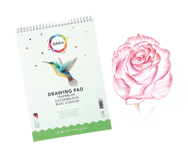 * Of je nu een beginner bent of een professionele kunstenaar, dit tekenblok van Qrea is geschikt voor iedereen! * Met dit tekenblok van 160 grams papier maak je de mooiste tekeningen of schetsen. * Dit schetsblok heeft een dubbele spiraal. * Het bevat radeervast papier. * Het harde karton aan de onderkant zorgt voor optimaal gebruiksgemak. * Afmeting: A4 formaat. * Blok à 24 vellen papier. * Diverse formaten beschikbaar. * Geproduceerd in Nederland.