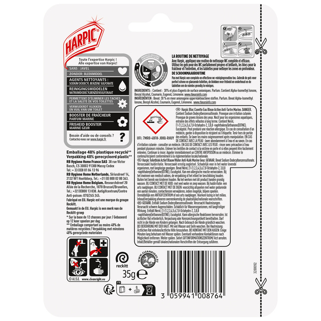 Voor een fris en schoon toilet * Actieve frisheid 4 weken* Tegen vlekken * Reinigingsschuim * Verpakking met minstens 54% gerecyclede materialen * Gevarenaanduidingen: H302, cat. 4: Schadelijk bij inslikken. H315, cat. 2: Veroorzaakt huidirritatie. H317, cat. 1: Kan een allergische huidreactie veroorzaken. H318, cat. 1: Veroorzaakt ernstig oogletsel. H319, cat. 2A: Veroorzaakt ernstige oogirritatie. H361, cat. 2: Kan mogelijk de vruchtbaarheid of het ongeboren kind schaden  . H400, cat. 1: Zeer giftig voor in het water levende organismen. H410, cat. 1: Zeer giftig voor in het water levende organismen, met langdurige gevolgen. H411, cat. 2: Giftig voor in het water levende organismen, met langdurige gevolgen. H412, cat. 3: Schadelijk voor in het water levende organismen, met langdurige gevolgen. * Veiligheidsaanbevelingen: P101: Bij het inwinnen van medisch advies, de verpakking of het etiket ter beschikking houden. P102: Buiten het bereik van kinderen houden. P103: Alvorens te gebruiken, het etiket lezen.