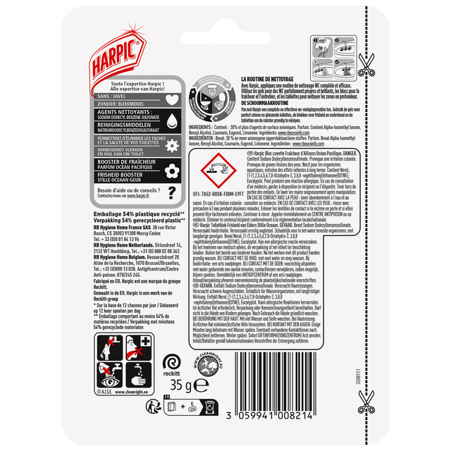 Voor een fris en schoon toilet * Actieve frisheid 4 weken* Tegen vlekken * Reinigingsschuim * Verpakking met minstens 54% gerecyclede materialen * Gevarenaanduidingen: H226, cat. 3: Ontvlambare vloeistof en damp. H302, cat. 4: Schadelijk bij inslikken. H315, cat. 2: Veroorzaakt huidirritatie. H317, cat. 1: Kan een allergische huidreactie veroorzaken. H318, cat. 1: Veroorzaakt ernstig oogletsel. H319, cat. 2A: Veroorzaakt ernstige oogirritatie. H361, cat. 2: Kan mogelijk de vruchtbaarheid of het ongeboren kind schaden  . H410, cat. 1: Zeer giftig voor in het water levende organismen, met langdurige gevolgen. H411, cat. 2: Giftig voor in het water levende organismen, met langdurige gevolgen. H412, cat. 3: Schadelijk voor in het water levende organismen, met langdurige gevolgen. * Veiligheidsaanbevelingen: P101: Bij het inwinnen van medisch advies, de verpakking of het etiket ter beschikking houden. P102: Buiten het bereik van kinderen houden. P103: Alvorens te gebruiken, het etiket lezen.