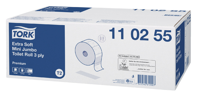 * Met Tork Mini Jumbo Toiletpapier wit T2 vermijdt je tekorten en tijdrovend onderhoud. * Het premium toiletpapier bevat meer papier dan de reguliere rollen en is daarom zeer geschikt voor toiletruimtes met een gemiddeld tot hoog aantal bezoekers. *Dit toiletpapier met 3 lagen zorgt voor een geweldige uitstraling en het zachte gevoel die gebruikers positief zal bijblijven. * Voor een hygiënisch en opgeruimd resultaat gebruik je bij de toiletrollen de Tork T2 dispenser. * Het toiletpapier met duurzaamheidscertificaten zoals FSC en Ecolabel is minder belastend voor het milieu. * Verpakking 12 rollen x 120mtr.