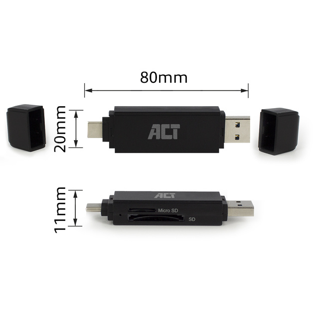 * Kaartlezer voor het overzetten van foto's en bestanden van en naar geheugenkaarten. * USB-aansluitingen: USB USB-C en USB-A. * Ondersteuning voor de meest gebruikte geheugenkaarten: SD/SDHC/SDXC/Micro SD. * Voldoet aan de SuperSpeed USB 3.1 Gen1 (USB 3.0) standaard. * Overdrachtssnelheid tot 5Gbps. * Zet bestanden en foto's over van en naar een geheugenkaart met de AC6375 USB 3.2 Gen1 Kaartlezer. Door het ultra-compacte design neem je de kaartlezer gemakkelijk overal mee naar toe. Haal overdrachtssnelheden tot 5Gbps dankzij SuperSpeed USB 3.2 Gen1. Gebruik de AC6375 op laptops en computers die zijn uitgerust met een USB-C of USB-A poort. * Handig voor onderweg. Door het compacte formaat neem je de AC6375 USB 3.2 Gen1 kaartlezer gemakkelijk overal mee naar toe. De AC6375 heeft ingebouwde USB-connectoren: USB-C en USB-A. Je hoeft dus geen extra kabels te gebruiken. * Ondersteuning voor de meest gangbare geheugenkaarten. De AC6375 Kaartlezer ondersteunt de meest voorkomende types geheugenkaarten waaronder: SD-, SDHC- en SDXC-kaarten. De AC6375 ondersteunt ook Micro SD- en T-FLASH-kaarten. * SuperSpeed USB 3.2 Gen1 (USB 3.0). De ACT AC6375 Kaartlezer maakt gebruik van de USB 3.2 Gen1 (USB 3.0) standaard. Deze standaard zorgt voor een overdrachtssnelheid tot 5Gbps. 1 stuk
