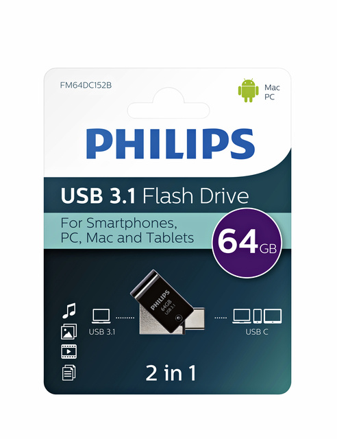 * Het opslaan en uitwisselen van bestanden tussen verschillende apparaten wordt nu wel heel eenvoudig. * Deze Philips 2-in-1 memory key is namelijk in het bezit van twee aansluitingen. * De USB-A-aansluiting kan gebruikt worden voor het opslaan en uitwisselen van bestanden met uw PC terwijl de USB-C-aansluiting gebruikt kan worden voor het uitwisselen van data met uw smartphone of tablet met USB-C-aansluiting. * Ultra Speed USB 3.1. * Snelle dataoverdracht met Ultra Speed USB 3.1. Zorgt voor het snel opslaan en lezen van (multimedia) bestanden, zoals foto’s en video’s. Maximale leessnelheid: 180MB/s. * 64GB Opslagcapaciteit. * 64GB is voldoende capaciteit voor het opslaan van minimaal 18.000 van uw favoriete foto’s of 11.200 MP3-bestanden*). * Eenvoudig in gebruik. * Een handig zwenkmechanisme beschermt de USB-C connector waardoor een dop overbodig wordt. * Opslagcapaciteit: 64GB. * USB klasse: Ultra Speed USB 3.1 Type A | Ultra Speed USB Type C. * Max. snelheid: Lezen: 180MB/s | Schrijven: 20MB/s. * Systeemeisen: Android 4.0 en hoger. Voor PC: Windows® XP en hoger, Mac OS 9.0 en hoger, Linux 2.4.0 en hoger.