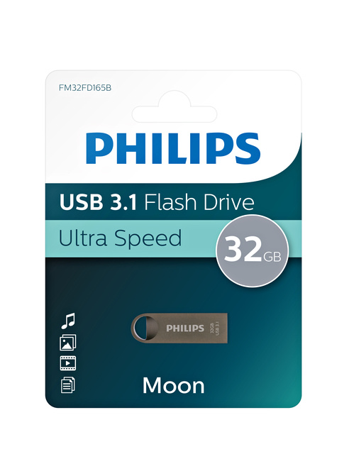 * Als het gaat om het opslaan van grote bestanden zijn data overdrachtssnelheden belangrijk. * Philips Moon USB 3.1 flash drives kunnen snel grote multimedia bestanden kopiëren van en naar de harde schijf van uw computer. * Het aluminium ontwerp zorgt voor een moderne uitstraling. * Ultra Speed USB 3.1. * Ondersteunt Ultra Speed USB 3.1-snelheden waardoor u snel (grote) bestanden kunt opslaan en niet lang hoeft te wachten. * Leest bestanden met een maximale snelheid van 180MB/s. * 32GB Opslagcapaciteit32GB is voldoende capaciteit voor het opslaan van minimaal 9.000 van uw favoriete foto’s of 5.600 MP3-bestanden*). * Eenvoudig in gebruik. * Door de ronde vorm kunt u de flash drive eenvoudig aan uw sleutelbos bevestigen zodat u uw bestanden altijd bij de hand heeft. * Opslagcapaciteit: 32GB. * USB klasse: Ultra Speed USB 3.1. * Max. snelheid: Lezen: 180MB/s | Schrijven: 25MB/s. * Systeemeisen: Windows XP en hoger, MAC OS 9.0 en hoger, Linux 2.4.0 en hoger. 1 blister x 1 stuk